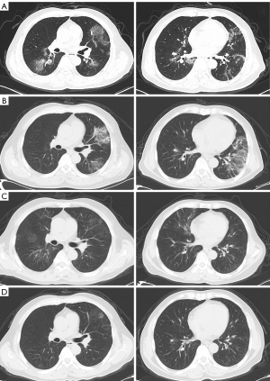 A 70-year-old man was enrolled in a clinical trial of anti-CD19 CAR T-cell therapy (ChiCTR1800019622) as a refractory FL patient at our center in November 2023. He was first diagnosed with COVID-19 when he was evaluated as having a CR in January 2024, without receiving a vaccine against SARS-CoV-2. He had symptoms of fever, cough, and breathlessness and had an oxygen saturation of 90–93% without oxygen inhalation. SARS-CoV-2 was found to be positive, while the CRP was 75.3 mg/L and the IL-6 level was 301 pg/mL. The expression of CD19 in B lymphocytes in the peripheral blood was 0.06%, and hypogammaglobulinemia was 15.1 g/L at this time. CT indicated interstitial pneumonia in both lungs (Figure 2A). He received molnupiravir, methylprednisolone (60 mg daily for 14 days), and symptomatic treatment, but his symptoms were not relieved, and SARS-CoV-2 remained positive. In the following 2 months, he received Paxlovid, methylprednisolone (40–60 mg, daily), and continuous oxygen therapy; however, he had persistent hypoxemia, severe cough, and persistent positive SARS-CoV-2 test results.