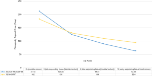 The PSA kinetics following prostate SBRT are distinct and may suggest a greater degree of efficacy when compared to those following treatment with CF-EBRT. One study from UCLA compared patterns of PSA response for 439 patients with low- or intermediate-risk prostate cancer following treatment with SBRT, high-dose-rate (HDR) brachytherapy, or CF-intensity modulated radiation therapy (IMRT) (60). The authors found that significantly more patients treated with SBRT or HDR brachytherapy had PSA nadirs of <0.5 ng/mL than those treated with IMRT (76.2% and 75.9% vs. 44.9%, respectively, P<0.0001) and that overall, SBRT and HDR brachytherapy caused significantly larger PSA decay rates (P<0.001) than IMRT, leading the authors to conclude that this difference in PSA kinetics may present a distinct radiobiological effect, and may be predictive of superior clinical outcomes. Other studies have confirmed that after one year of treatment, when compared to patients receiving treatment with CF-EBRT, the median PSA slope and nadir are lower for patients treated with SBRT (61,62).