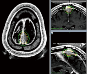 Otherwise, SRS for recurrent GBM is supported by a series of small prospective and retrospective series with either hypofractionated stereotactic radiotherapy or SRS, often with concurrent bevacizumab, with an expected 10–14 months MS following therapy following dosing schemes similar to RTOG 90-05 and is supported by society guidelines (29,44-49). Larger trials, such as the ongoing RTOG 12-05, are needed to formalize this treatment approach, but it remains a viable option for patients without extensive progression when recurrent GBM is diagnosed. An example of such a treatment is illustrated in Figure 2.