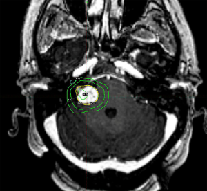 Treatment options for vestibular schwannomas include observation, SRS, fractionated radiotherapy, and surgery. To date, there is no high quality evidence comparing these treatment modalities (80). The best evidence comes from various meta-analyses published over the years. Expected local control with SRS is ≥90% with only 4% requiring additional treatment (79). Post-SRS rates of facial and trigeminal neuropathy have declined in concert with decreasing radiation dose, without an unacceptably high recurrence rate at 5–10 years’ time (81). Currently, single doses of 12–13 Gy appear to confer high rates of local control with greater sparing of nearby nerve function. An example of one such treatment is illustrated in Figure 5. Useful hearing preservation appears to be associated with a ≤4 Gy cochlear dose, but this has not been confirmed in a prospective study (82). At doses of 12–13 Gy, 5-year actuarial hearing-level preservation rate is approximately 70% with most changes occurring within the first 4–5 years and stabilizing thereafter (83). Surgery remains a reasonable choice of therapy, with similar rates of control but slightly higher rates of associated operative morbidities and a substantially more protracted post-procedural recovery period (79).