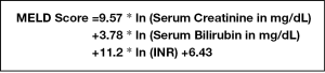 The MELD score, initially developed to determine prognosis following a transjugular intra-hepatic shunt (TIPS) procedure for liver failure (8), is now widely used in the liver transplant arena to prioritize donor liver allocation. It is a logarithmic score that is comprised of International Normalized Ratio (INR), serum creatinine, total serum bilirubin and the etiology of cirrhosis. After minor modifications, the resulting MELD model, which has been validated in 4 independent populations (9), can be generalized to all patients with end-stage liver disease.