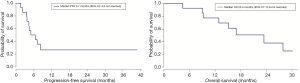 A total of 14 patients (6 men, 8 women) were enrolled in this study. The baseline characteristics of the patients are summarized in Table 1. The median patient age was 49 years (range, 39-57 years). The most common primary sites of ACC were the sublingual gland and the maxillary sinus in 3 patients. Eight patients were had stage IV ACC at the time of diagnosis. All patients included in this study received prior local treatment before CAP chemotherapy, except for 1 patient: 10 patients underwent surgical treatment and 13 patients received prior radiotherapy. Five patients received other systemic treatment including chemotherapy and tyrosine kinase inhibitors. The median time from initial diagnosis of ACC to CAP chemotherapy was 51.0 months (range, 1.8–268.6 months). The median follow-up duration was 29.2 months.
