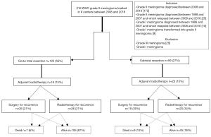 We retrospectively included 216 patients treated for a grade II meningioma in six centers in France between January 2008 and December 2018. Meningioma diagnosis was confirmed according to the 2016 WHO classification. Benign meningiomas transformed into grade II were also included. We recorded the following variables: gender, age at diagnosis and tumor location. The management strategy for each patient was retrospectively assessed as follows: surgery extent (gross total resection, GTR; or subtotal resection, STR), adjuvant radiotherapy, radiation therapy and surgery at recurrence time, and systemic therapy. Adjuvant radiotherapy means radiotherapy after the first surgery regardless of extent of surgery. The quality of surgery was defined according to the Simpson classification. Total resection was defined as Simpson grade 1, 2 and subtotal resection was defined as Simpson grade 3, 4, 5.
