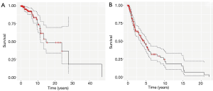 The median PFS and OS times for patients with a Ki-67 proliferative index greater than 17.5% and those with a Ki-67 index less than 17.5% were 5.5 versus 2.9 years and 23.8 versus 11.1 years, respectively (P=0.2) (Figure 3A,B).